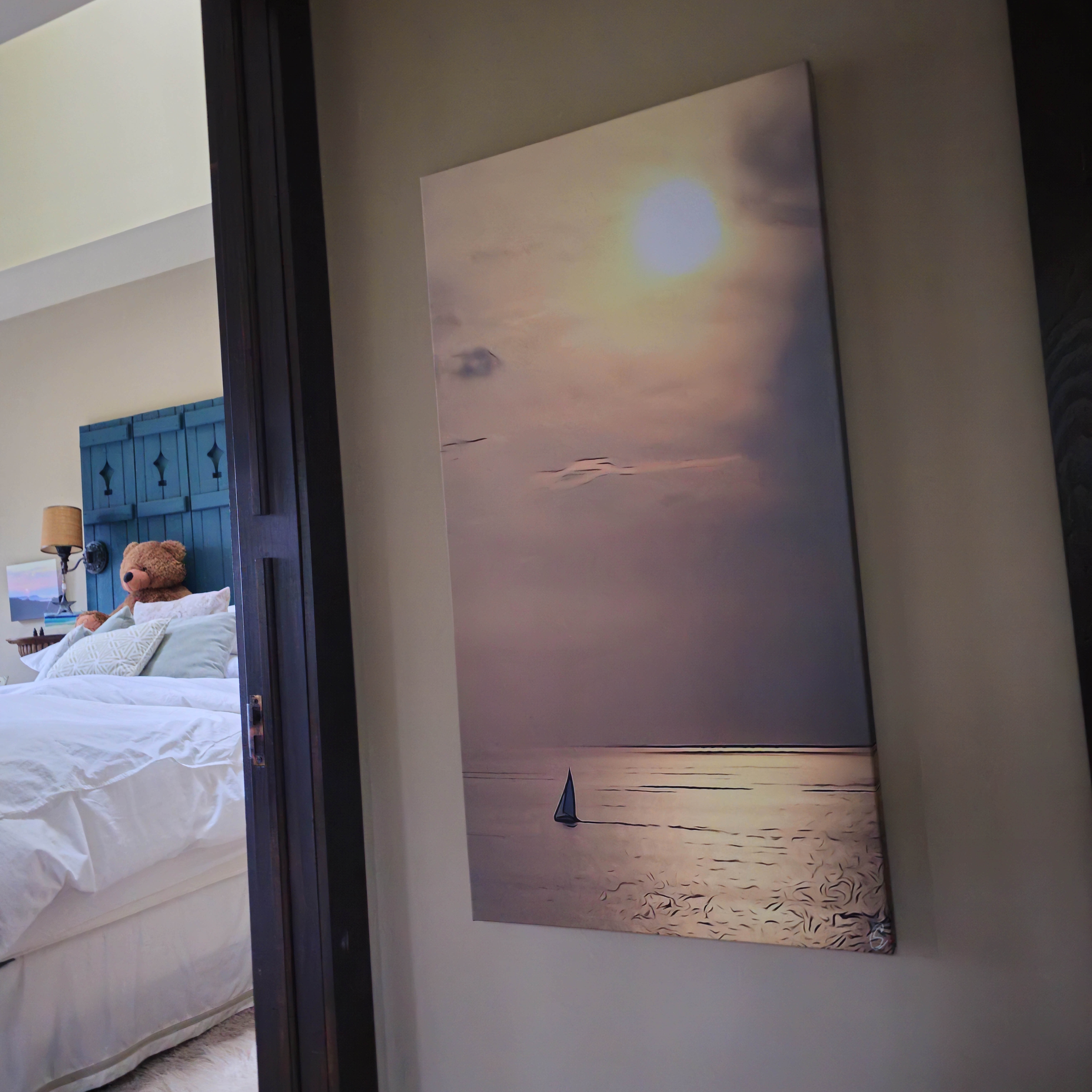My work is for sale. My art displays are large, unique, bold statement pieces. They bring a wall/room to life. In my home, as the darkness of evening arrives my pieces further show their magic, using picture lighting, which brings my work even more alive.
